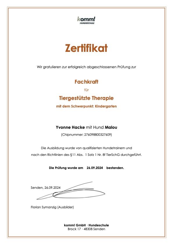 Lano, Malou und Mina arbeiten als Therapiehunde in unserer Einrichtung. Lano & Malou begleiten Yvonne zur Arbeit, Mina begeleitet Melanie. Beide Teams bieten immer wieder in Einzelstunden Kindern ganz besondere Momente. Bei gemeinsamen Spaziergängen, beim gemeinsamen Lesen, Turnstunden und vielem mehr genießen Hund und Kind die gemeinsame Zeit.